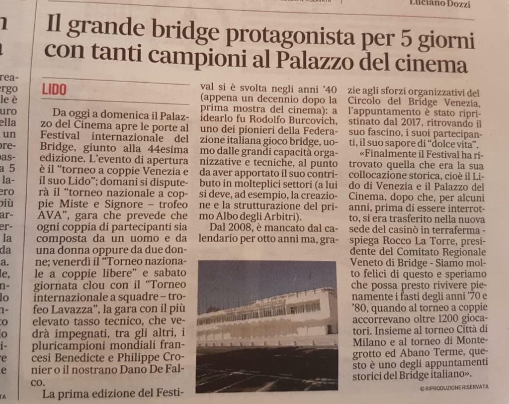 Per tutti gli interessati aggiungiamo link per avere in tempo reale i risultati di tutta la manifestazione e l’articolo dedicato al bridge dal Gazzettino