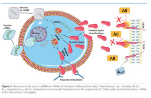 Quando le cellule target del vaccino muoiono o vengono distrutte dalla risposta immunitaria, le proteine Spike prodotte circolano sotto forma di proteine “free-floating”. Queste proteine Spike “free-floating” possono, quindi, legarsi ai recettori ACE2 (angiotensin-converting enzyme 2) provocando l’internalizzazione, degradazione e perdita delle attività catalitiche dei recettori stessi. Questo fenomeno provoca una rapida riduzione di angiotensina1,7 per la ridotta inattivazione dell’angiotensina II da parte dei recettori ACE2. Lo sbilanciamento tra angiotensina II (iperattivazione) e angiotensina1,7 (riduzione) può giocare un ruolo diretto nella genesi dell’acuto rialzo dei valori di pressione arteriosa sistemica.