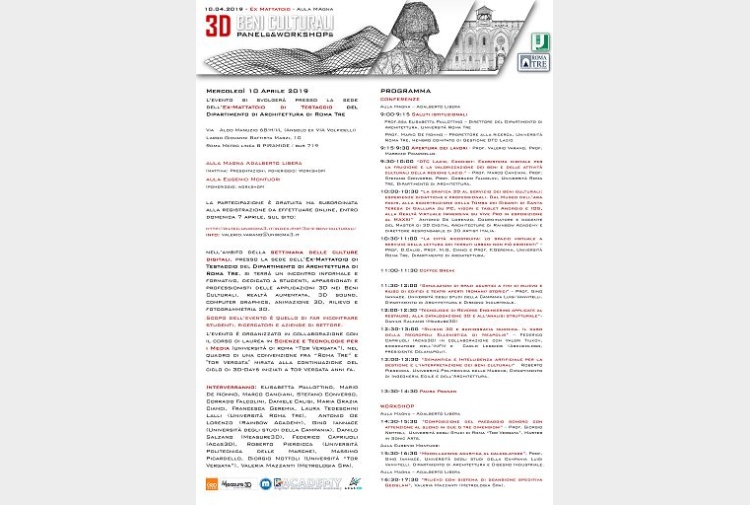 Roma, 9 apr. (askanews) – Mercoledì 10 aprile, nell’ambito della settimana delle culture digitali, presso la sede dell’Ex-Mattatoio di Testaccio del Dipartimento di Architettura di Roma Tre, si terrà un incontro informale e formativo, dedicato a studenti, appassionati e professionisti delle applicazioni 3D nei Beni Culturali, realtà aumentata, 3D sound, computer graphics, animazione 3D, rilievo e fotogrammetria 3D. Scopo dell’evento è quello di far incontrare studenti, ricercatori e aziende di settore.L’evento è organizzato nell’ambito dei corsi di laurea in Architettura (Dip. di Architettura Roma Tre), Scienze e Tecnologie per i Media (Dip. Matematica Tor Vergata) e Scienze Computazionali (Dip. Matematica e Fisica Roma Tre), all’interno di una convenzione tra le Università “Roma Tre” e “Tor Vergata”, che coinvolge i seguenti laboratori:- LIMeS-Laboratorio Interdipartimentale di Matematica Applicata e Meccanica delle Strutture (Dip. di Architettura e Dip. Matematica e Fisica Roma Tre) – Laboratorio www.formulas.it (Dip. di Architettura Roma Tre) – Laboratorio RilTec-Rilievo e Tecniche Digitali (Dip. di Architettura Roma Tre) – Laboratorio di Scienze Computazionali (Dip. di Matematica e Fisica Roma Tre) Laboratorio di Fotografia Digitale e Realtà Virtuale (Dip. di Matematica Tor Vergata)Interverranno all’evento: Elisabetta Pallottino, Mario De Nonno, Marco Canciani, Stefano Converso, Corrado Falcolini, Daniele Calisi, Maria Grazia Cianci, Francesca Geremia, Laura tedeschini Lalli (Università Roma Tre), Antonio De Lorenzo (Rainbow Academy), Gino Iannace (Università degli studi della Campania), Danilo Salzano (Measure3D), Federico Capriuoli (Acas3D), Roberto Pierdicca (Università Politecnica delle Marche), Massimo Picardello, Giorgio Nottoli (Università “Tor Vergata”), Valeria Mazzanti (Metrologia Spa).