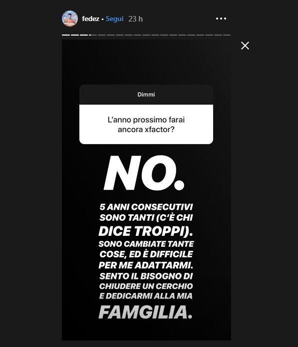Il no è di quelli belli grandi, sentiti. Fedez lascia X Factor con una storia su Instagram. “5 anni consecutivi sono tanti (c’è chi dice troppi)” scrive il rapper, rispondendo a una domanda di un fan. “Sono cambiate tante cose, ed è difficile per me adattarmi. Sento il bisogno di chiudere un cerchio e dedicarmi alla mia famiglia”, spiegando così perché non parteciperà all’edizione del 2019. Quanto a chi lo sostituirà, scrive, “faccio una previsione di Nostradamus”, suggerendo di tenerla “a mente”. “Sicuramente ci sarà un artista che ha sempre sputato” sui “talent (X Factor nello specifico) sia nei pezzi che nelle interviste” e che “ha criticato me o altri giudici in diverse occasioni”. “Questo perché l’underground a volte (non sempre) è incoerenza e moralismo che si sposano con la frustrazione”. “Sarà l’anno in cui verranno al pettine, insomma” conclude aggiungendo una emoticon con la gocciolina di sudore.