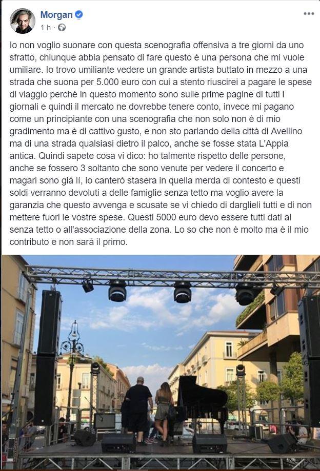 “Io trovo umiliante vedere un grande artista buttato in mezzo a una strada che suona per 5.000 euro con cui a stento riuscirei a pagare le spese di viaggio, perché in questo momento sono sulle prime pagine di tutti i giornali e quindi il mercato ne dovrebbe tenere conto. Invece – scrive Morgan – mi pagano come un principiante con una scenografia che non solo non è di mio gradimento, ma è di cattivo gusto,e non sto parlando della città di Avellino, ma di una strada qualsiasi dietro il palco, anche se fosse stata L’Appia antica”.