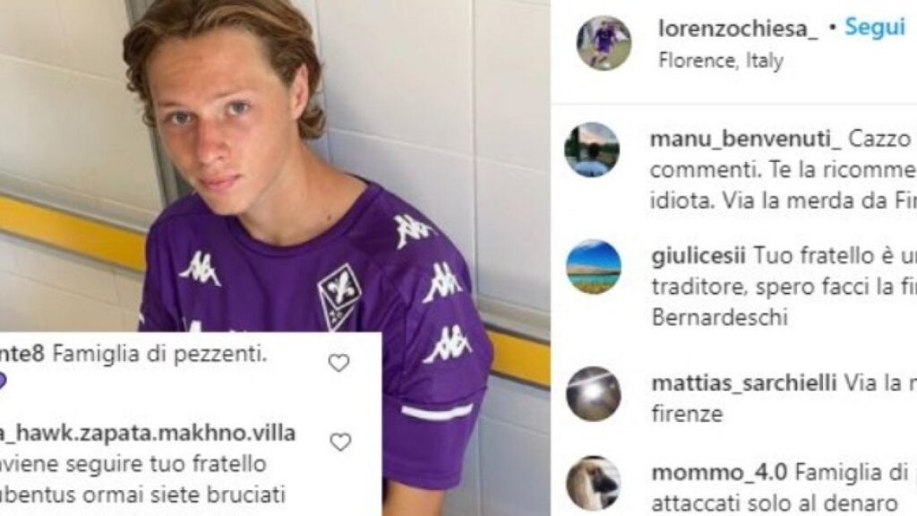 FIRENZE – “Accidenti a tuo padre e tuo fratello”, “Non vogliamo la m… a Firenze”, “Mercenari, andate via”. Non si placano le polemiche dopo il passaggio di Federico Chiesa dalla Fiorentina alla Juventus. Alcuni tifosi viola, dopo aver già esposto uno striscione fuori dal Franchi contro l’ormai ex capitano, accusato di tradimento per essere passato ai rivali bianconeri, adesso hanno preso di mira Lorenzo Chiesa, fratellino minore di Federico classe 2004, che milita ancora nelle giovanili viola.
