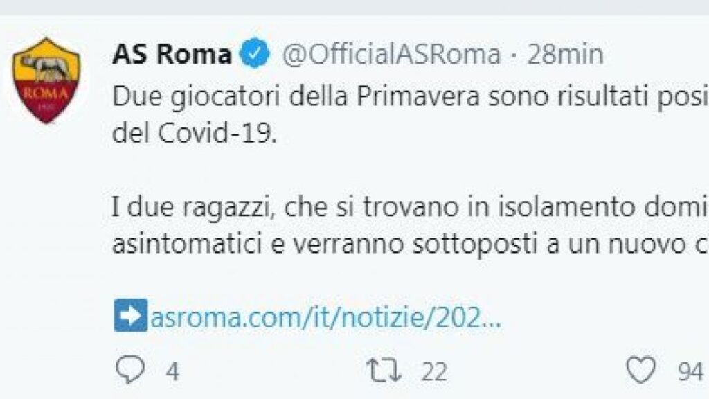 ROMA – Torna l’allarme coronavirus nel calcio italiano. Un paio di calciatori della Roma Primavera sono risultati positivi al covid a seguito di una delle regolari visite di controllo previste dal protocollo societario.
