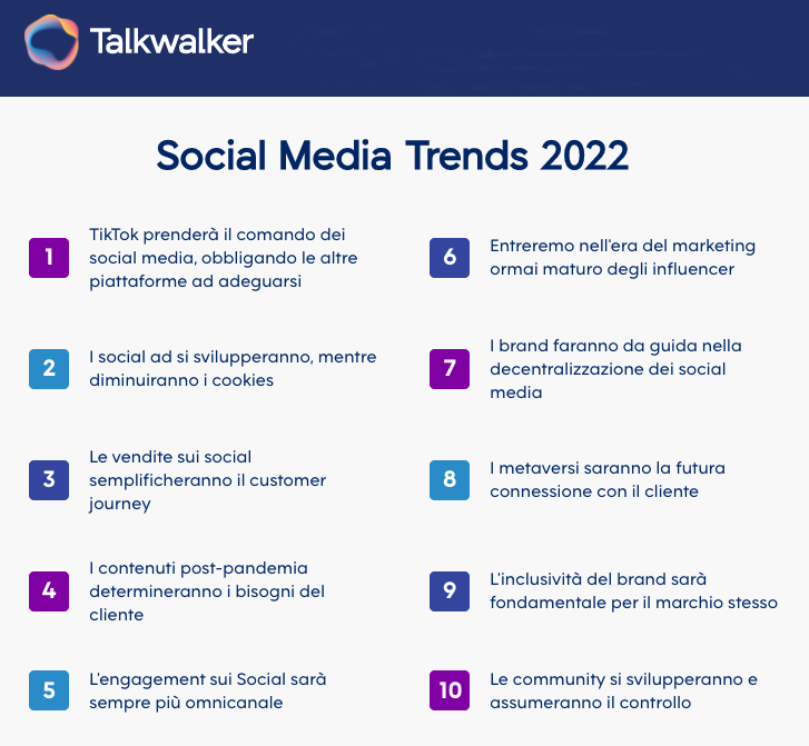 Nel 2022 TikTok prenderà il sopravvento su tutti gli altri social. Questa è una tra le previsioni che emergono dall’annuale studio “Social Media Trends 2022” di Talkwalker, colosso multinazionale leader mondiale nella Consumer Intelligence, che ogni anno stila i 10 trend in materia di social media per l’anno successivo