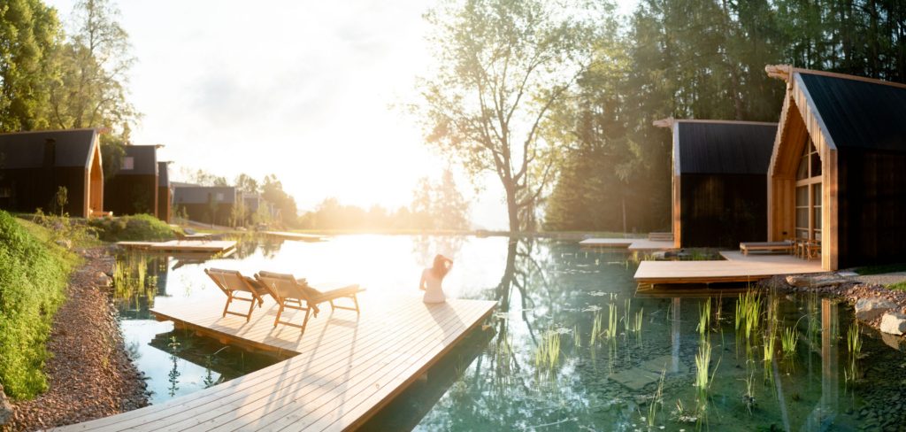 Dotata di suggestiva SPA nel bosco, la struttura è stata costruita in legno nero e seguendo il concept della “foresta”, affinché si integrasse perfettamente con il contesto naturalistico, ed è composta da un corpo centrale e attorno 20 chalet dotati di sauna e caminetto, alcuni situati intorno ad un grazioso laghetto naturale.