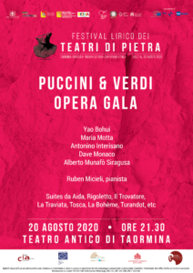 Il prossimo 20 Agosto, alle 21.30, presso il Teatro antico di Taormina continua il tour del Festival Lirico dei Teatri di Pietra 2020, prestigiosa kermesse lirico sinfonica promossa dal Coro Lirico Siciliano, con un gala interamente dedicato ai due massimi compositori della tradizione operistica: Giuseppe Verdi e Giacomo Puccini.